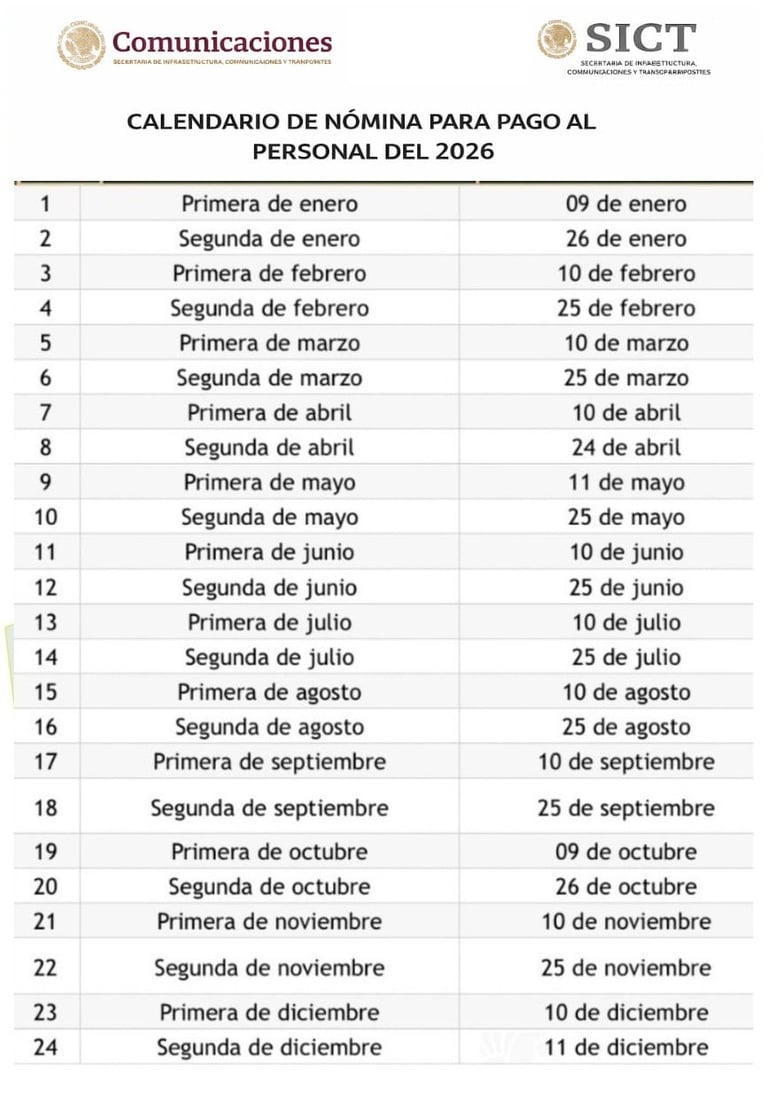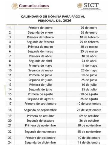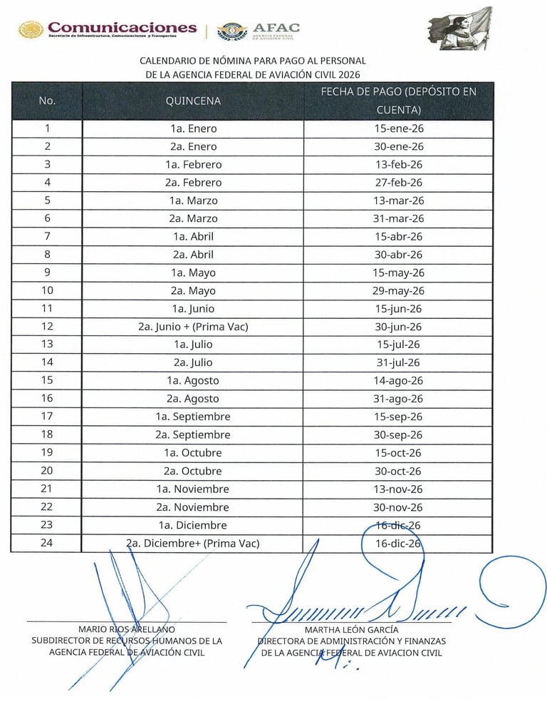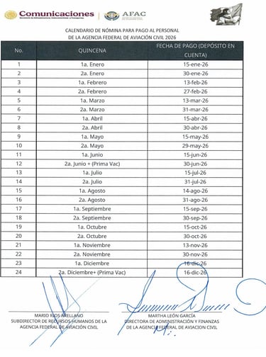 En este contexto, la existencia de un calendario de pago distinto para el personal de la AFAC durante el presente año, respecto del calendario aplicado al sector central de la SICT, ha generado inquietud entre trabajadores, particularmente considerando que en años anteriores los calendarios de pago eran similares o equivalentes dentro de la misma Secretaría.